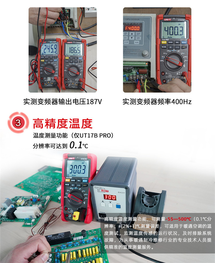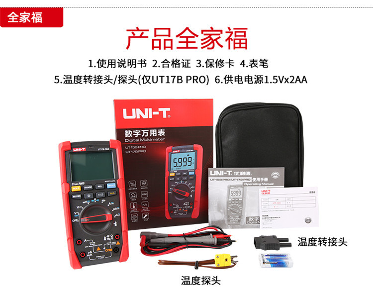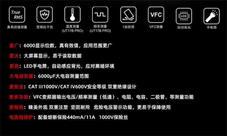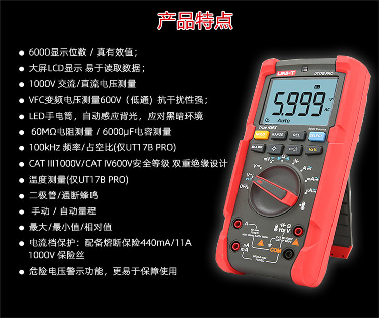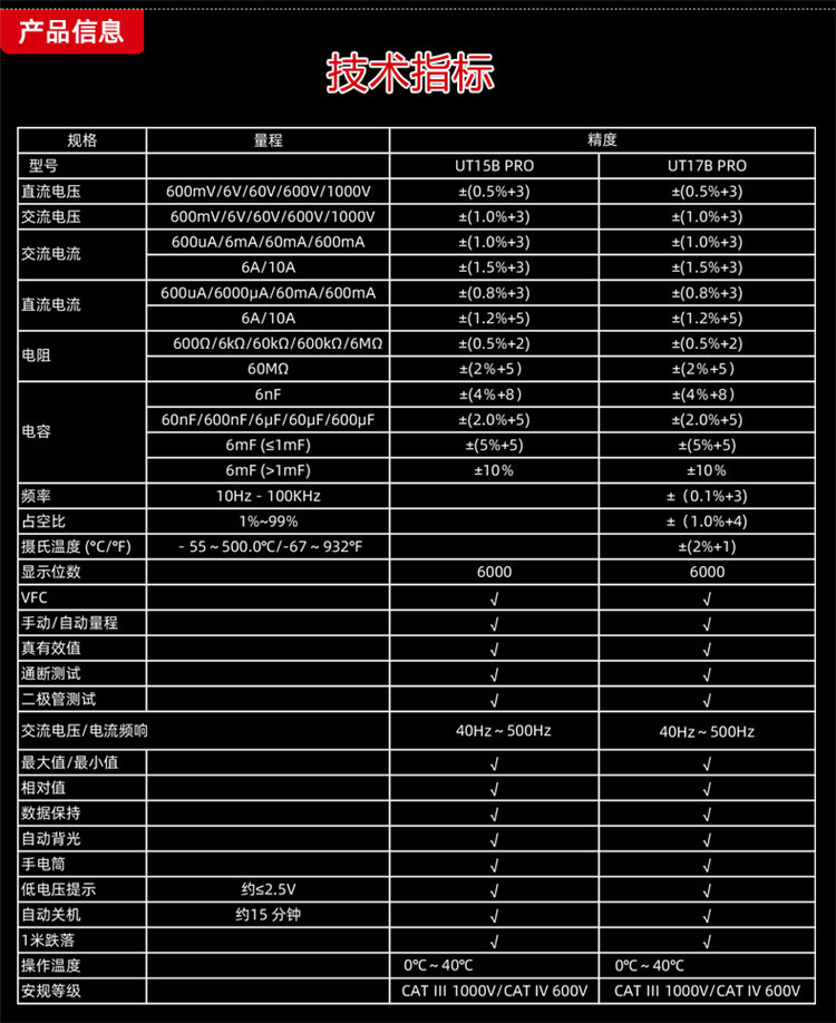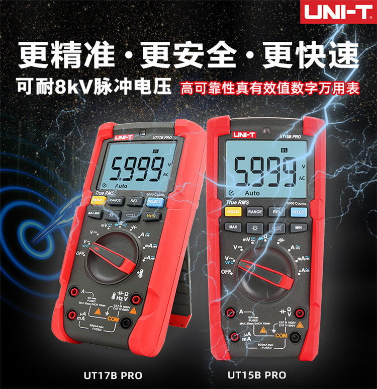 规格 UT15B PRO(电压1000V/电流10A) 368.00元 100件可售 UT17B PRO(频率/占空比/温度) 458.00元 100件可售